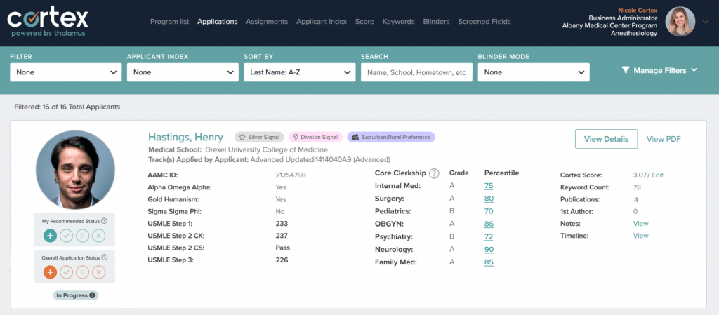 This is an optional status that all Cortex users can submit. These actions are aggregated and tallied on the Cortex "Assignments" page to guide Program Directors, Administrators and/or Coordinators in assigning an overall application status. Multiple recommended statuses (i.e. one per reviewer) can be applied per applicant.
