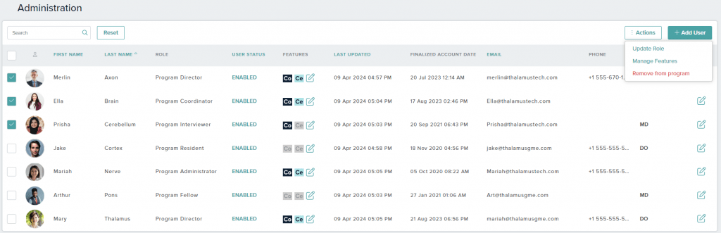 - Manage bulk actions, including role updates and program access to all Thalamus products.