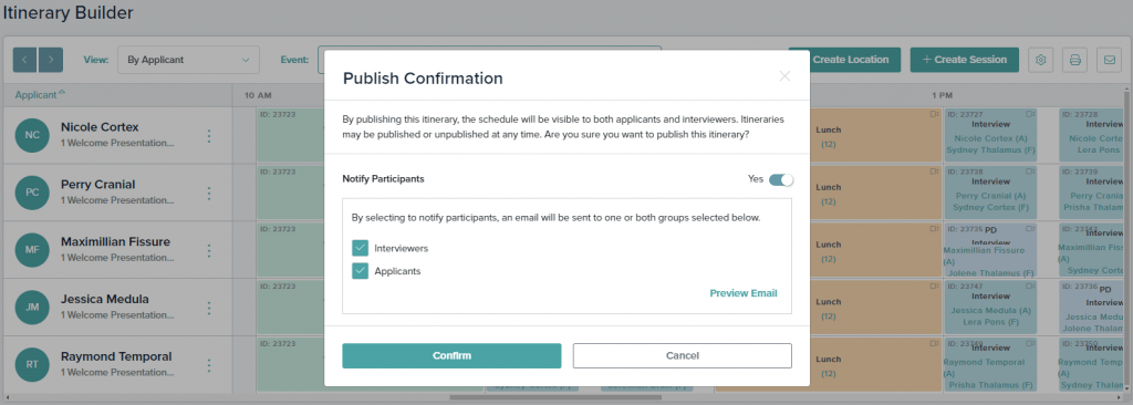 - Send email notifications regarding finalized/published itineraries to applicants and/or interviewers directly from the itinerary builder!