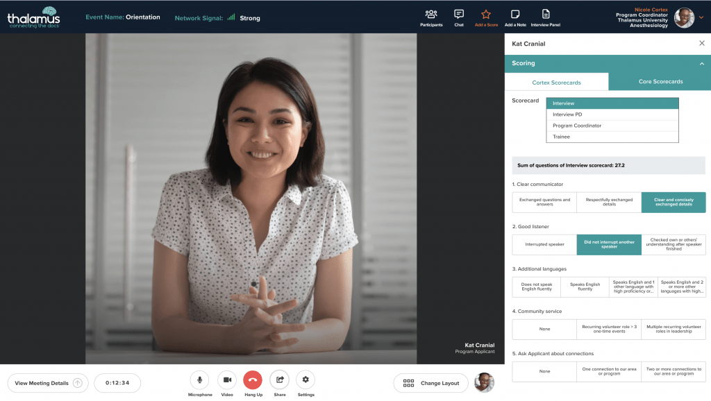 - Embedded scoring using Thalamus Holistic Review. Faculty can embed scoring and notes directly in each video interview room. This data automatically integrates into Thalamus’s rank list feature as well!
