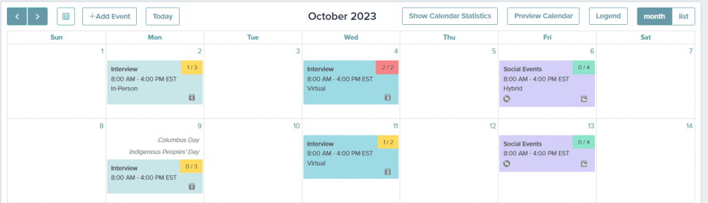 - Preview your program calendar from the applicant perspective (and by track/tier) to better understand how the calendar will appear to applicants when scheduling interviews.